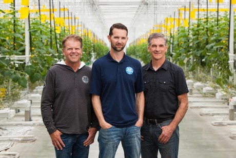 Van links naar rechts, Big Marble Farms partners Rick Wagenaar, Ryan Cramer (directeur) en Albert Cramer