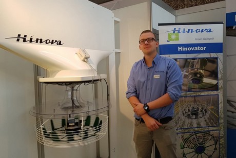 Jan Willem van Ostaay in de stand van Hinova. Jan Willem kreeg al veel Amerikaans bezoek met vragen over ventilatie en klimaat in de cannabisteelt. "Vooral lichtdicht is bij installatie extra belangrijk", vertelt hij.