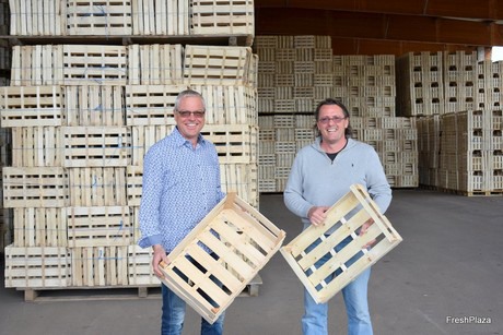 Uwe Groll, van GROW e.V., bezoekt Markus Benninger in zijn krattenfabriek in Bundenthal.