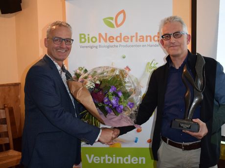 Bavo (rechts) werd op 12 juni tijdens het jaarevent van BioNederland nog even in het zonnetje gezet. Links Jan Groen.