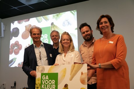 V.l.n.r: Arie van Doesburg (Dirk), Jaap Seidell (VU), Coosje Dijkstra (VU), Samuel Levie (Food Cabinet) en Karin Bemelmans (NAGF) van het Ga voor kleur lab.