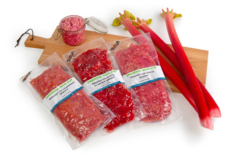 Last but not least op het ‘wensenlijstje’ van de rabarbertelers: productinnovatie. Niet in de richting van nieuwe rassen, want elke teler vermeerdert zijn eigen pollen en dat werkt prima. Nee, de innovatie komt uit een heel andere hoek. Jella Theeuwen: ‘Leander en ik zijn samen naar Tavola 2018 in Kortrijk geweest, dé toonaangevende Europese beurs voor fijne en verse voeding met zowel klassieke delicatessen als ook trendy food. We zijn daar in contact gekomen met het bedrijf Kempen foods, dat sous-vide gegaarde producten maakt waaronder asperges, witlof en spruiten. Sous-vide is het langzaam garen van een product in een vacuüm verpakking, zodat er zo min mogelijk smaak, geur, vocht, vitaminen en mineralen verloren gaan. Ook de ‘bite’ blijft hierdoor behouden. Wij dachten in eerste instantie dat zij zich vooral op de horeca zouden richten, maar hun producten bleken ook al in de schappen van bijvoorbeeld Delhaize te liggen. Dat was voor ons aanleiding om verder met Kempen foods te willen praten. Samen met de PC Rabarber en de expertise van Kempen foods ben ik toen aan de slag gegaan om tot de ontwikkeling van nieuwe recepturen te komen, wat aanvankelijk tot zes varianten heeft geleid die we samen met de telers hebben geproefd. Daar zijn drie varianten uit voortgekomen waar we nu concreet mee de markt opgaan: rabarber-honing, rabarber-aardbei en rabarber-sinaasappel. Zonder suiker, zonder kleur- of smaakstoffen, maar op natuurlijke wijze gezoet met honing, aardbeien en sinaasappel.’