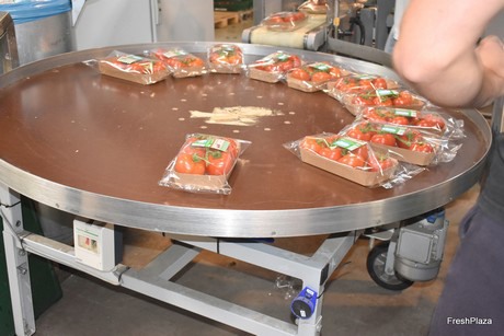 Verpakte tomaten voor de retail. Het grootste deel van de producten belandt uiteindelijk in filialen in Nordrhein-Westfalen en Niedersachsen. Door het etiket op de tomatenverpakking kan een 100 procent traceerbaarheid tot aan de plant gegarandeerd worden.