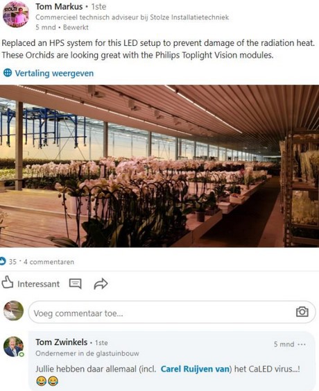Later deelde Tom Markus (Stolze) een artikel op LinkedIn dat Stolze trots was op een gerealiseerde LED installatie. Tom Zwinkels, die ondertussen Carel van Ruijven (Stolze) al 'CaLED' noemde door zijn constante positieve uitingen van mogelijkheden op het gebied van LED, reageerde op het artikel dat 'wij' allen te enthousiast waren.