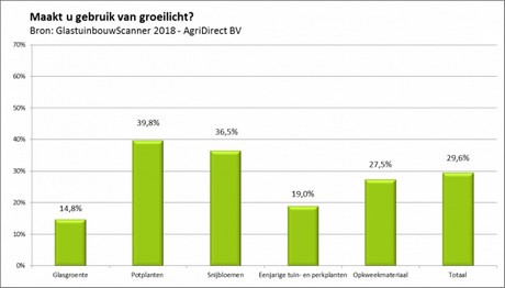 In totaal maakt bijna een derde van de glastuinders gebruik van groeilicht in kassen. Potplantentelers maken met 39,8% het meest gebruik van groeilicht, gevolgd door snijbloementelers met 36,5%.