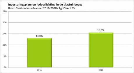 15,5% van de glastuinders heeft interesse om te investeren in ledverlichting. 3,6% hiervan geeft aan ‘zeer geïnteresseerd’ te zijn in de aanschaf van ledverlichting in de kassen. Dit is een stijging ten opzichte van 2016. Toen gaf in totaal 13% aan (zeer) geïnteresseerd te zijn in ledverlichting.