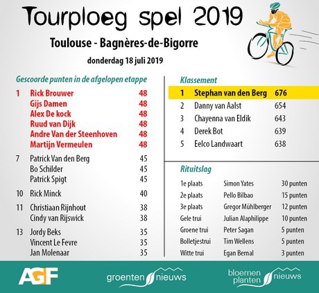 Een dagzege die zij deelden met Simon Yates die het sprintje won na een bergetappe die finishte in Bagnères-de-Bigorre. De gele trui bleef, het is inmiddels geen verrassing meer, in handen van Stephan van den Berg. Nieuw in de top 5 van het klassement: Eelco Landwaart.