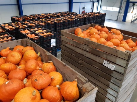 Tholen – Het Nederlandse pompoenseizoen bij De Terp Squashpackers in Erichem is officieel begonnen. Ook is de bouw van een nieuwe bewaarschuur is bijna voltooid. "Eind juli is de eerste oogst uit eigen land binnengekomen. De primeur was voor Maatschap Corsten-Breukers uit Kelpen-Oler. Zij hebben een vervroegde teelt, waardoor ook het seizoen eerder aanvangt. Albert Heijn zit nu een week of twee op Hollandse bio-pompoenen", vertelt Jeroen Robbers. De Terp teelt zelf biologische pompoenen en werkt daarnaast samen met ongeveer 30 andere telers. "Deze telers beschikken samen over zo’n 200 hectare waarop pompoenen groeien. Deze pompoenen komen allemaal naar ons bedrijf. Wij voeren grotendeels ook het oogstwerk uit."