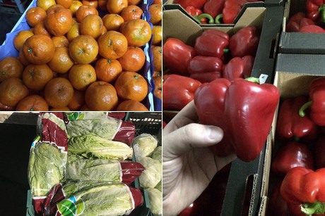 Foto's van groenten en fruit in Rusland. Mandarijnen uit China, Romaine sla en Paprika's uit Iran.