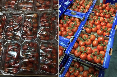 Foto's van groenten en fruit in Rusland. Cherrytomaten uit Marokko en trostomaten uit Iran.