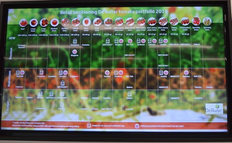 Na het toosten op de opening van de nieuwe tool, kon iedereen informeel verder met de ‘Global Meeting’ over nieuwe rassen. Rassen waarmee telers en retailers de komende tijd weer kennis kunnen gaan maken. Dat kan in de demokas, die op individuele basis weer bezocht kan worden nadat de kas even gesloten was voor bezoek in verband met ToBRFV, maar ook door een blik te werpen op het Global Positioning Screen. Op dat scherm, dat door Nico elk jaar geüpdatet wordt, is te zien welke rassen er allemaal beschikbaar zijn en hoe die rassen in de markt gezet zouden kunnen worden als premium-, mainstream- of budgetoptie. “Wij geven slechts advies aan de retail met onze kennis van kleur, smaak, inhoudsstof of vorm.”