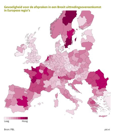 De economisch grotere Nederlandse regio’s (Zuid-Holland, Noord-Holland en Noord-Brabant) worden bij een ‘harde’ Brexit gebaseerd op WTO-tarieven en aangevuld met niet-tarifaire belemmeringen minder hard door de Brexit getroffen dan de economisch kleinere regio’s. Dat komt onder meer doordat bedrijven in deze economisch grotere regio’s minder afhankelijk zijn van economische relaties met het VK. Maar voor met name Zuid-Holland, Noord-Holland en Utrecht zijn de effecten onzeker. In deze regio’s zijn de effecten van een Brexit het meest afhankelijk van de details van de uittredingsovereenkomst. Dit komt door de specifieke bedrijvigheid die zich in deze regio’s bevindt en die al naar gelang de details van het uittredingsverdrag en hun regiospecifieke afhankelijkheid van handelsrelaties met het VK, in grote of slechts kleine mate door de Brexit getroffen zullen worden. In Europa valt op dat de effecten van de Brexit in Duitsland en Tsjechië relatief ongevoelig zijn voor de details van de uittredingsovereenkomst. Dit komt doordat de economieën in deze landen meer verweven zijn met de economie van het Verenigd Koninkrijk waardoor er altijd wel effecten zijn ongeacht de details van de uittredingsovereenkomst.