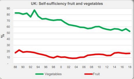 Vorig jaar is het aandeel van in eigen land geteelde groenten in het Verenigd Koninkrijk lager geweest dan ooit. Nog maar net iets meer dan de helft (53%) van het binnenlands verbruik aan verse groenten