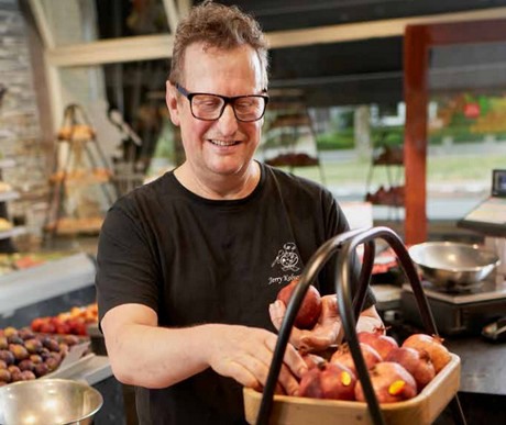 Net als veel collega’s heeft Jerry ook ‘bietensap’ door zijn aderen stromen. Zijn vader stond op de markt met groenten en fruit en daar was Jerry als kind ook al regelmatig te vinden. In 1984 kwam de gelegenheid op zijn pad om een winkel te beginnen aan de Schuttersweg in Apeldoorn en tot op de dag van vandaag runt hij daar, samen met zijn vrouw, nog steeds de speciaalzaak. Vorig jaar werd een spannend besluit genomen. De winkel werd verbouwd tot een prachtige, moderne groenten- en fruitspeciaalzaak. Jerry vertelt hierover: “De winkel was best wel verouderd en dan kom je voor het vraagstuk te staan of je op dezelfde voet door moet gaan, wetende dat je daarmee wellicht op termijn klanten gaat kwijtraken ... of toch nog een keer verbouwen. De keuze viel op de tweede optie en tot op de dag van vandaag heb ik daar geen moment spijt van gehad. Door de nieuwe opstelling in de winkel (van bediening naar zelfkeuze) is er veel meer nadruk gekomen op ons assortiment bewerkte producten. Inmiddels maakt dat meer dan 50% uit van mijn omzet. Het is ook leuk om te merken dat dit een aantrekkingskracht is naar verschillende doel- en leeftijdsgroepen. Naast een goede stijging van de gemiddelde besteding heb ik ook onze klantenaantallen zien stijgen met minimaal 5%. Onze winkel zit niet in een winkelcentrum, maar aan een doorlopende weg. Wel een drukke weg richting het centrum, mensen moeten dus wel speciaal stoppen voor mijn winkel en dat doen er dus steeds meer.