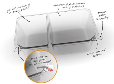 Hoe werkt de PressurePack? Direct na de bereiding wordt de schaal geseald, waarbij het slimme EasySteam ventiel de overtollige druk gecontroleerd afvoert. Zodra de inhoud voldoende is afgekoeld, wordt het ventiel in de "gesloten modus" geplaatst (zie foto). Hierdoor wordt de schaal volledig en luchtvrij afgesloten. De tamper evident(TE)-sluiting garandeert het eenmalige gebruik. Voordat de eindgebruiker de maaltijd opwarmt, dient men de TE-sluiting te verbreken. De maaltijd of portie groenten kan nu de magnetron in.