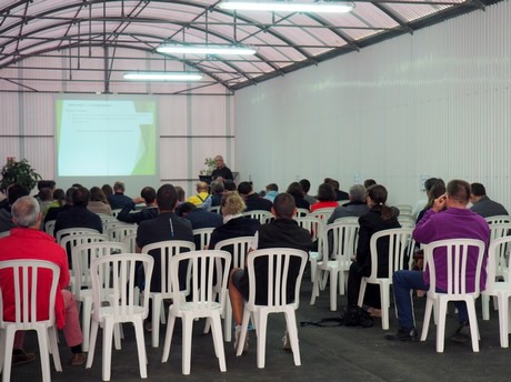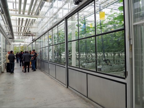 Na het verwelkomen van de gasten, nodigden Eric Brajeul (directeur van het operationele centrum van Carquefou), Serge Le Quillec (experimenteel ingenieur die verantwoordelijk is voor het programma voor teelttechnieken in de kas van Carquefou) en Emilie Legast (onderzoeksingenieur) de deelnemers uit om de kassen te komen bekijken en de tests op de komkommergewassen en op een dozijn tomatenrassen, bestand tegen meeldauw te komen bestuderen.