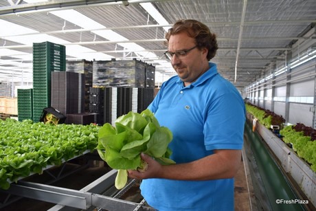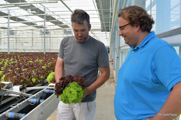 Florian Wolz bij een lid met hydroponische slateelt.