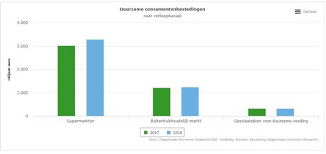 In het supermarktkanaal zijn de bestedingen aan duurzaam voedsel in 2018 met 9% gestegen. Voor koffie en thee steeg de omzet met 36% en in eieren met 25%. De foodservice kende een omzetstijging van 3% in producten met een duurzaamheidskenmerk. Bij speciaalzaken voor duurzame voeding daalde de omzet met 1%. In 2018 heeft de Nederlandse consument naar schatting in totaal circa 1,6 miljard euro besteed aan duurzaam voedsel met het keurmerk Biologisch. Dit is inclusief de afzet van biologisch in afzetkanalen buiten de steekproef.
