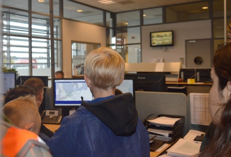 De kinderen drommen om het bureau van Tewin van Pelt die laat zien ‘waar de bootjes varen’. Hij wijst aan dat op de vrachtbrieven staat waar de containers vandaan komen en legt uit hoe de containers verzegeld worden.