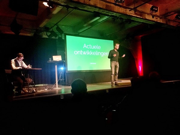 Erik Does aan het woord. Links van hem Steven van @VisueelVergader. "Hij heeft tijdens de presentaties zijn creativiteit de vrije loop gelaten. De vele verhalen heeft hij visueel samengevat in tekeningen en quotes. Hele bijzondere en waardevolle toevoeging", aldus Udea Veghel op twitter.