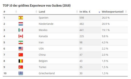 Spanje is 's werelds grootste exporteur van komkommers. Met een aandeel van 26% aan de totale exportmarkt voor het jaar 2018 overtrof het Zuid-Europese land Nederland (20,9%) en Mexico (19,1%), die op de tweede en derde plaats staan. De wereldwijde exportmarkt had mondiaal een waarde van meer dan 2,3 miljard euro.