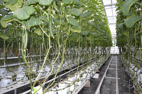 Proeven met komkommers in ‘de Kas’: kokossubstraat en biologische voeding. Lichte schade aan de bladeren vanwege hoge temperaturen.