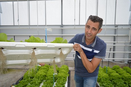 Karel de Bruijn toont het wortelstelsel van de sla uit de proef ‘sla op water’.