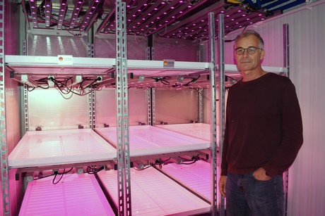 Carlo Castelijn in de kant van de container waarin drie ‘Deense karren’ naast elkaar passen. Indien gewenst kunnen ook beide kanten van een Grow&Roll-systeem met Deense karren worden voorzien.