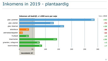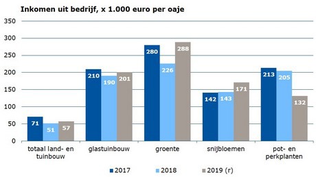 In de glasgroenten zouden inkomsten vooral gestegen zijn door betere tomaten- en paprikaprijzen en ook snijbloemenkwekers hebben betere prijzen geïncasseerd. Energiekosten zouden echter gedaald zijn. Het inkomen van telers van pot- en perkplanten wordt in 2019 aanzienlijk lager geraamd.