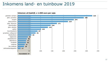 Naar goed gebruik heeft Wageningen Economic Research de inkomsten voor de verschillende land- en tuinbouwsectoren weer geraamd. Uitkomst is dat de gemiddelde ondernemer € 57.000* verdiend heeft. Dat is 6.000 euro meer dan vorig jaar.