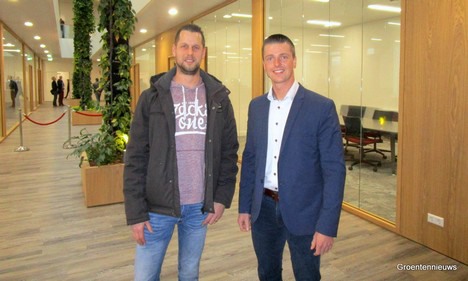 Ruben Voois, tot anderhalve week geleden in dienst van Horconex, maar inmiddels aan de slag gegaan bij John Snoek Glastuinbouwtechniek, nam uiteraard ook even een kijkje. Hij blijft ook in zijn nieuwe functie (samen)werken met Horconex en staat hier op de foto met Tim Kreuger van Alumat Zeeman.