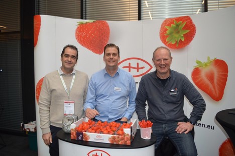 Johan Van Alphen deed een rondje beurs, want ook bij Veiling Zaltbommel liep hij even langs. Hier met links Henk Bekkers en rechts Arthur Elsen. Bij Veiling Zaltbommel werd begin december begonnen met Elsanta's uit Portugal en dit zal doorlopen tot eind april/begin mei. Binnenkort komt ook 'smaakaardbei' Gariguette erbij.