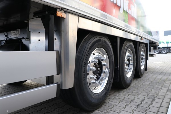 - Er zitten SAF assen onder de opleggers met twee liftassen, totaal drie assen. Lichtmetalen Alcoa velgen, Dura Bright uitvoering.