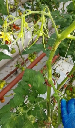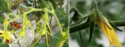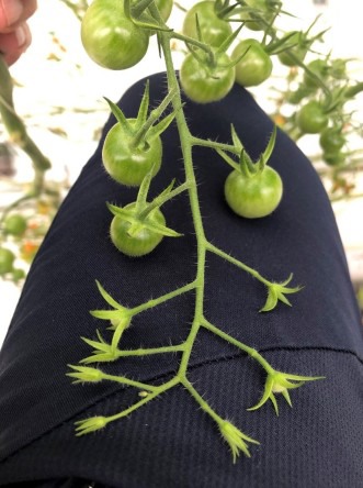 De vruchtzetting van tomatenbloemen is een extreem belangrijk proces. Telers zullen herkennen hoe de kwaliteit van de tomaten en de vruchtgrootte zal zijn bij de oogst wanneer ze de vroege fases van de vruchtzetting in de gaten houden. Als de zetting goed is, zoals in de foto hierboven, dan is het fruit gelijk in grootte en op gelijke afstand.