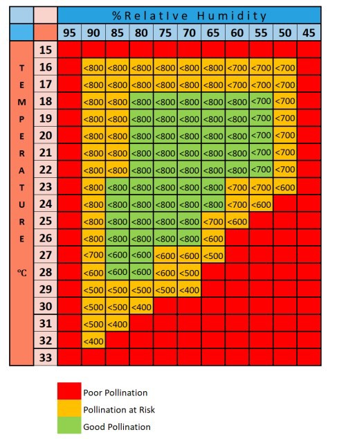 Eerder in dit artikel gaven we de grenzen voor een goede bestuiving, gerelateerd aan temperatuur en luchtvochtigheid als aparte kwantiteiten. Het is waar dat om een slechte zetting door uitputting te voorkomen een hogere temperatuur kan worden aangehouden, als dit wordt vergezeld van een hogere luchtvochtigheid. Een temperatuur van 30 graden Celsius bij een luchtvochtigheid van 85% zal leiden tot een goede bestuiving. Een temperatuur van 30 graden en een luchtvochtigheid van 60% zal de bestuiving te lijden hebben.