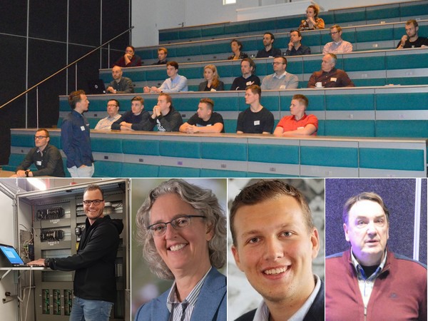 De zaal en de sprekers: Danny den Hollander (Beekenkamp Group), Colinda de Beer (InnovationQuarter), Kevin Kleijwegt (Hoogendoorn Growth Systems) en Roel van Heijningen (Lentiz). Ook Remco Duijverman van Hoogendoorn is lid van de werkgroep, maar hij was gisteren niet aanwezig.