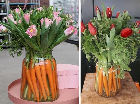 Tholen- In het Noorden van Nederland is een nieuwe trend opgepikt die tot een leuke samenwerking heeft geleid. Bij Super AGF markten en Bloem en Plant prijkt sinds dit weekeinde vazen met kleurrijke combinaties van wortelen en tulpen. “Ik zag deze combinatie langskomen op een Instagrampost van mijn leverancier en vond dat zo leuk. Toen heb ik het zelf eens uitgeprobeerd”, vertelt Regina Schut van Bloem en Plant uit Musselkanaal. “Ik was benieuwd of het loof mooi zou blijven en dat is zo.”