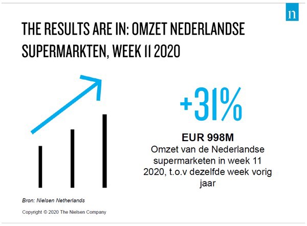 De omzet van de Nederlandse supermarkten bedroeg in week 11 van dit jaar 998 miljoen euro, een stijging van ruim 31% ten opzichte van dezelfde week vorig jaar, aldus Nielsen.