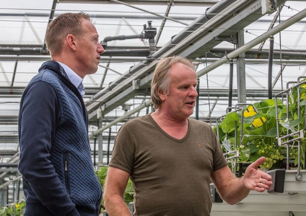 Mark van der Werf (Koppert Biological Systems) en Michiel Penninx (medeaandeelhouder Fragaria Innova) in gesprek over de praktijkproef
