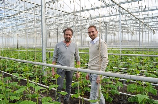 Coert Lamers van Nautilus Organic (links) neemt een kijkje bij de komkommerplanten van Gert van Brakel