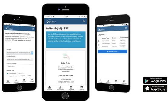 Dankzij de app kunnen klanten schade melden, eigen actuele glasvoorraad inzien en het onderhoud van de kas tot op de voet volgen. "Wederom een stap vooruit in ontwikkeling en een verdere uitbreiding van onze dienstverlening naar de klant", aldus Rody Bakker van TST BV.