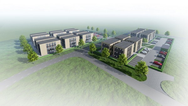 Een tekening van het appartementencomplex waar ca. 300 flexwerkers gehuisvest zullen worden