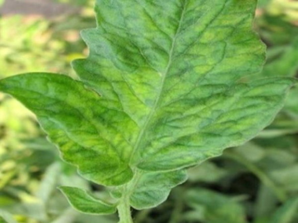 Foto 1: Tomatenblad dat op natuurlijke wijze is geïnfecteerd met ToBRFV