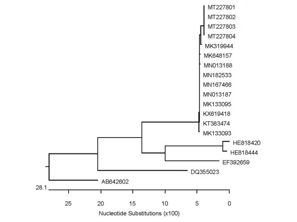 Vier monsters met ToBRFV werden gezuiverd en gesequentieerd in beide richtingen. De gedeeltelijke nucleotide volgorde van deze isolaten werd bepaald en ingediend bij GenBank. De nucleotide volgorde van de Egyptische isolaten hadden 92,2-94,4% gemeen met de isolaten uit Palestina, Duitsland, het Verenigd Koninkrijk, Israël, Jordanië, Italië en Mexico en een paprika-isolaat uit Jordanië. Een fylogenetische stamboom (figuur 3) toonde genetische variaties tussen de Egyptische isolaten en die van andere landen.