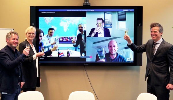 V.l.n.r.: Alastair Monk en Meiny Prins namens Priva, Toms Rekšņa, Gints Antoms en Normunds Bergs namens Aranet, Patrick Dankers, Bram Koppert en Ton Wallast namens Priva