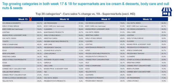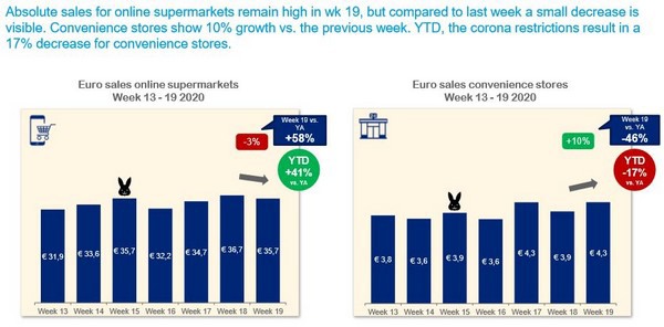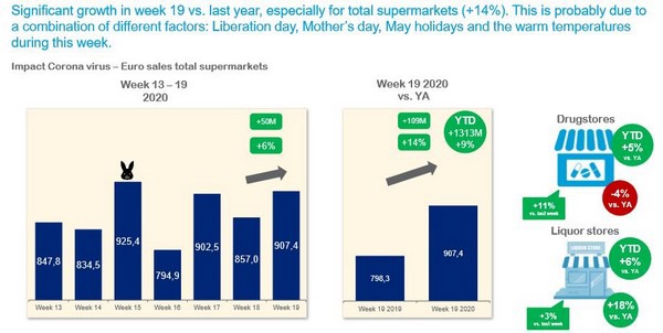 Voor totaal supermarkten valt op dat de omzet voor week 19 met ruim €907 miljoen behoorlijk hoog is. Waarschijnlijk door de combinatie van meer verwennen thuis tijdens Bevrijdingsdag (wat dit jaar een officiële vrije dag was) en Moederdag, minder mensen op vakantie tijdens de Meivakantie én het warme weer wat standaard een impuls geeft aan de groei van frisdrank, bier, ijs en barbecue-producten.