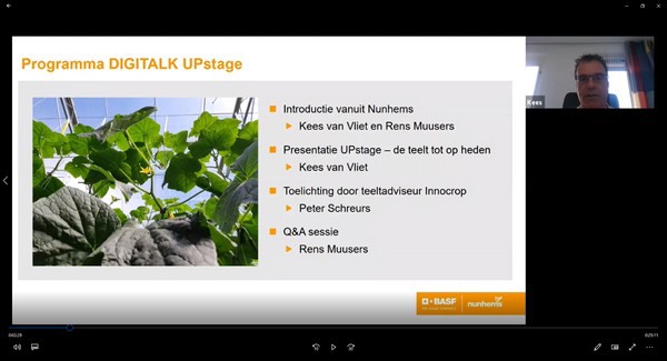 Samen met telers en teeltadviseurs keek BASF in een Digitalk naar de teeltsituatie. Kees van Vliet, Account Manager komkommer, trapte de UPstage Digitalk af met een inleidende presentatie over het ras, de resultaten van 2020 en voorafgaande jaren en de ervaringen tot op heden. “UPstage is sterk op zijn vrucht en selectief. Het is niet gevoelig voor mycos, splijtkoppen, broei- en zwarte koppen. Dat maakt dat het ras onder de wisselende weersomstandigheden die we in het voorjaar in de niet-belichte teelt hebben, niet of nauwelijks abortie laat zien,“ aldus van Vliet.