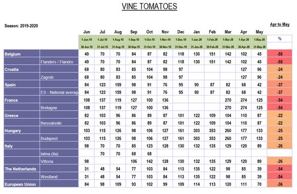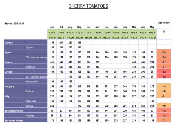 Een rondje langs de tomatencijfers verzameld door de Europese Commissie leert dat in de segmenten cherry, tros en rond de gemiddeldeprijzen ten opzichte van april vrijwel overal zijn gedaald.