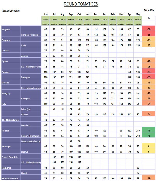 Eigenlijk is er maar één uitzondering: Polen noteert een stijging in gemiddelde prijs in het segment ronde tomaten van 73% tussen t.o.v. april. Telers kregen gemiddeld 2,10 voor hun product, al zijn daar statisch gezien wel kanttekeningen bij te plaatsen.