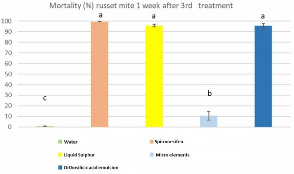 De proeven zijn vier keer herhaald. Bij een groep behandeld met een biostimulant op basis van een food-grade orthosiliciumzuuremulsie werd wekelijks steeds minder galmijt aangetroffen. Aan het einde van de proefperiode was de plant nagenoeg vrij van galmijt en was er geen schade zichtbaar. Terwijl de onbehandelde referentie volledig was aangetast.